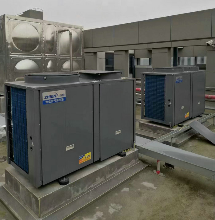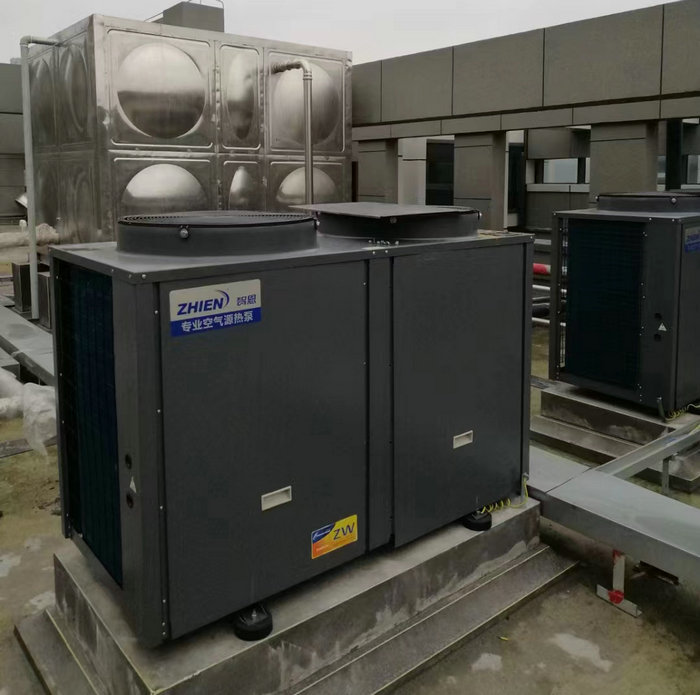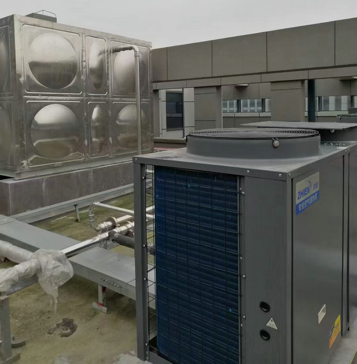 杭州三墩公交停保基地生活用水熱水工程,采用了智恩商用空氣能熱泵熱水機10匹機兩臺+15噸不銹鋼方形水箱(3*2.5*2)